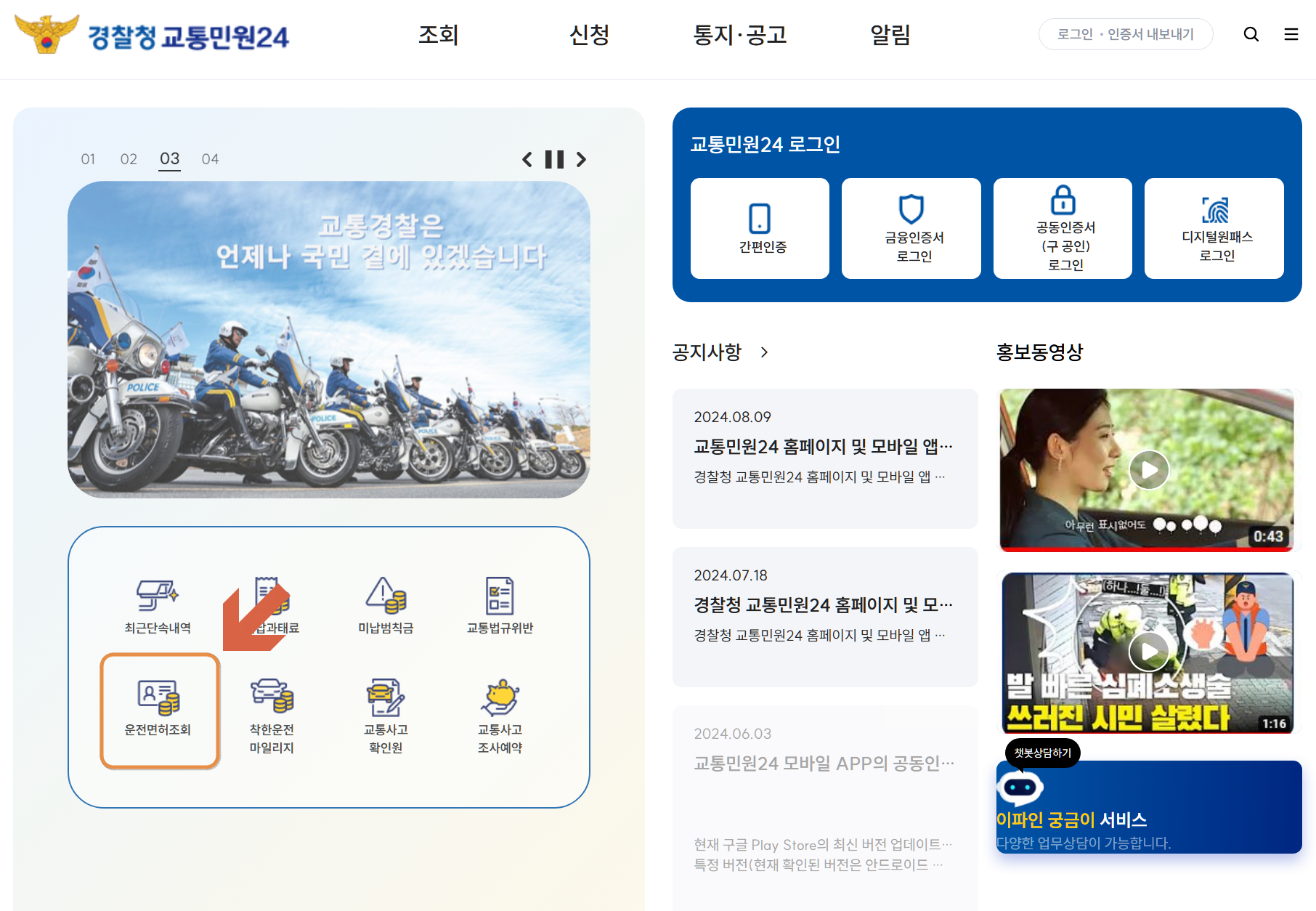 3. 경찰청 교통민원 24 홈페이지의 운전면허조회를 클릭합니다.