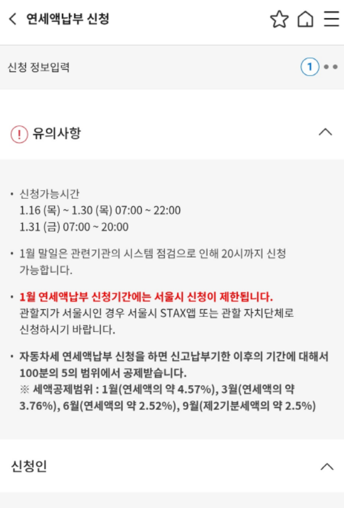 - 연납 할인율: 연납 할인은 매년 1월 기준으로 적용되며, 늦게 신청할 경우 할인 혜택이 줄어들 수 있습니다. 신청기간에 따른 할인율에 대한 자세한 내용은 아래 글에서 참조하시기 바랍니다.