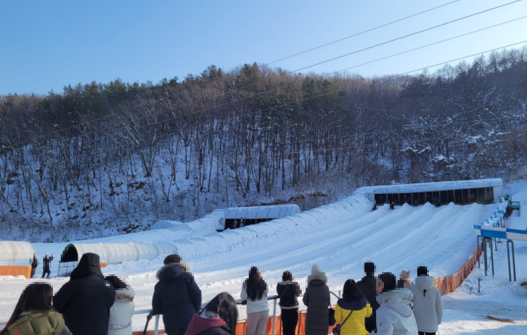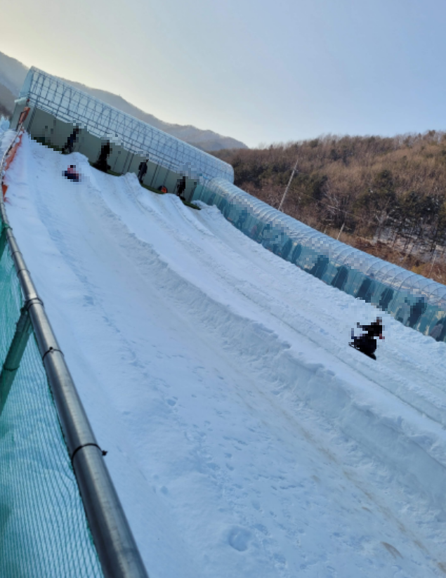 사람이 많았지만 슬로프도 길고 어른이 타도 재미있을 만한 경사와 어린 아이들도 탈 수 있는 얕은 경사 슬로프도 준비되어 있었습니다. 중앙 메인 썰매장 외에도 썰매장이 하나 더 있으니, 너무 붐비면 다른 썰매장을 이용하는 것도 좋은 방법입니다.